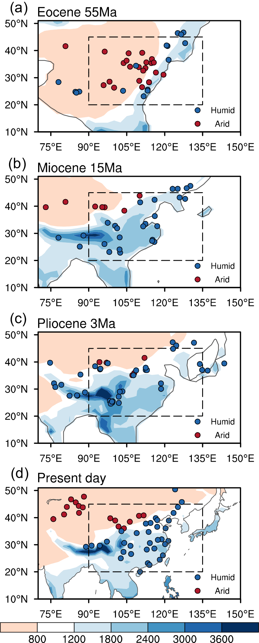 图1 新生代典型时期东亚季风气候的演变。填色表示模式模拟的年降水量(单位:毫米/天),圆点表示代用记录和观测资料。