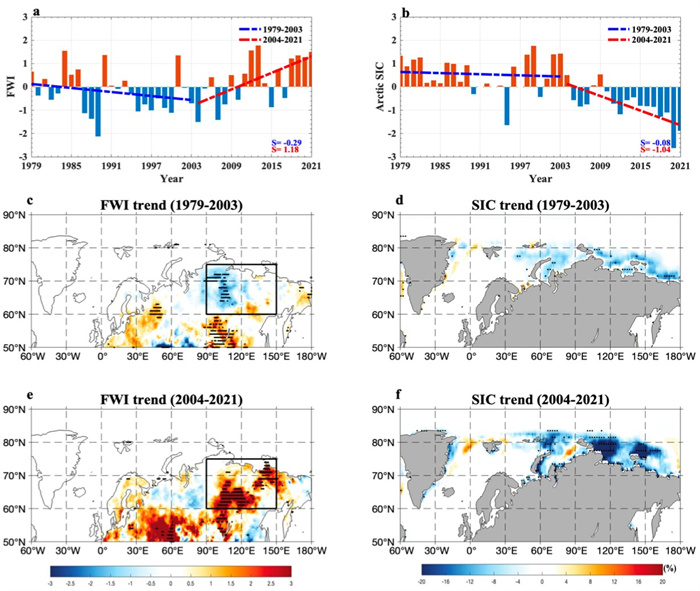 图1. 1979-2021东西伯利亚夏季火灾天气指数(FWI)和俄罗斯海冰密集度距平(SIC)的时间变化以及FWI和SIC在1979-2003和2004-2021年间的线性趋势。