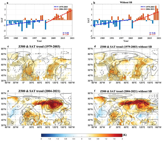 从图1可以看出,在2004-2021东西伯利亚野火的上升趋势似乎与俄罗斯北极地区夏季海冰快速的减少密切相联,并有较高的相关性。主要原因是俄罗斯北极地区夏季海冰的快速减少可以在东西伯利地区引起较强的地面气温增加和较强的反气旋环流,从而导致东西伯利地区出现明显的增暖趋势,如图2所示。这个增暖趋势可以导致该地区饱和水汽压亏缺(Vapor Pressure Deficit, VPD)的增强, 而饱和水汽压亏缺的增加可以控制东西伯利亚地区野火的活动,因此东西伯利亚地区野火的趋势可以由VPD的增加趋势来解释。不同于传统的归因分析方法,我们提出了一个新方法,即通过包含和排除西伯利亚阻塞(Siberian Blocking, SB)事件,可以识别内部大气变率和外强迫(海冰融化等)在东西伯利亚地区野火快速增加中的不同作用。研究发现大约21%的VPD的增加主要由和西伯利亚阻塞有关的大气内部变率导致,而79%的VPD增加则由俄罗斯北极地区夏季海冰的快速减少所导致。