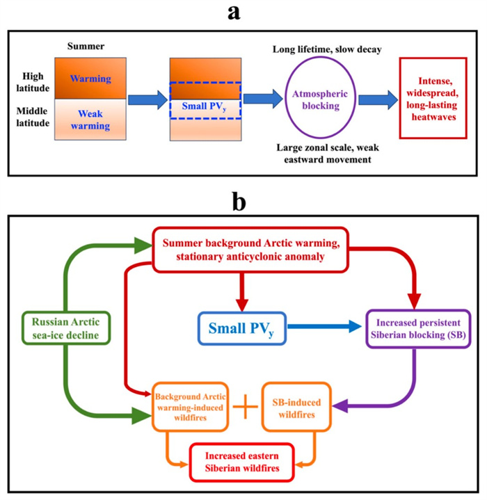 另外,在该研究中利用我们自己所建立的大气阻塞非线性多尺度相互作用(NMI)模式的位涡梯度理论,提出了俄罗斯北极地区海冰的快速减少通过影响西伯利亚阻塞和东西伯利亚野火增强的新机制,如图3所示。北极地区海冰的减少可以增强高纬度地区增暖,从而引起较小的经向位涡梯度,这能够导致高纬度地区出现持续时间更长,纬向尺度更大,东移较小和衰减更慢的西伯利亚阻塞,从而导致更持续、范围更大和强度更强的高纬度热浪,进而导致东西伯利亚高纬度地区出现更强,更持久和范围更大的野火事件。俄罗斯北极地区海冰的快速减少和西伯利亚阻塞的变化的共同作用是东西伯利亚高纬度地区野火快速增加的主要原因。