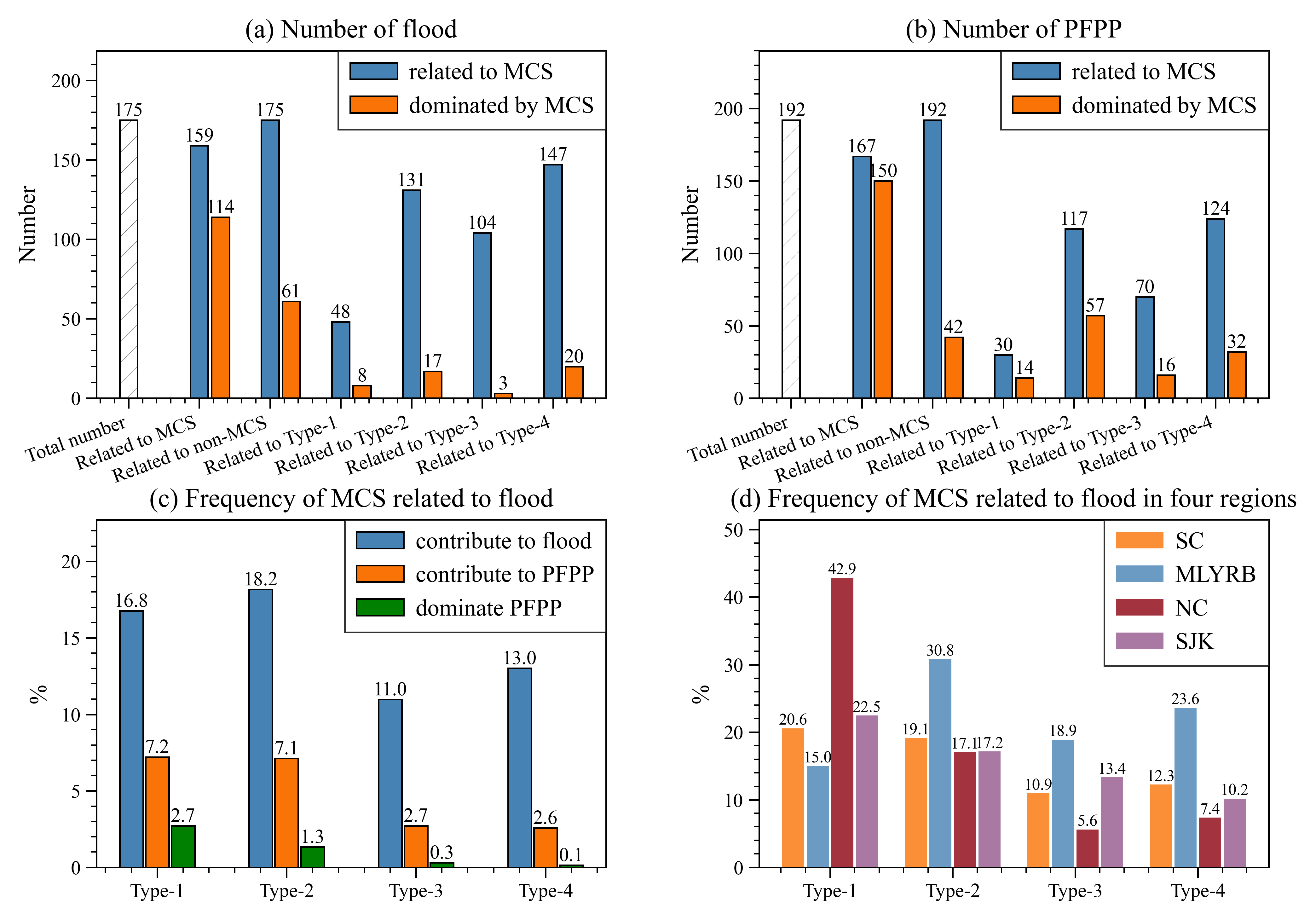 图1(a)与MCS相关、由MCS主导的洪水数量。(b)与MCS相关、由MCS主导的潜在洪峰(PFPP)数量。(c)每类MCS中对洪水有贡献的比例、对PFPP有贡献的比例以及主导PFPP的比例。(d)在华南地区、长江中下游、华北地区和日本南部−朝鲜半岛MCS对洪水有贡献的比例。华南地区(16°N~25.5°N,102°E~127°E),长江中下游(27°N~33°N,105°E~125°E),华北地区(34°N~48°N,107°E~123°E)和日本南部−朝鲜半岛(31°N~41°N,125°E~140°E)。