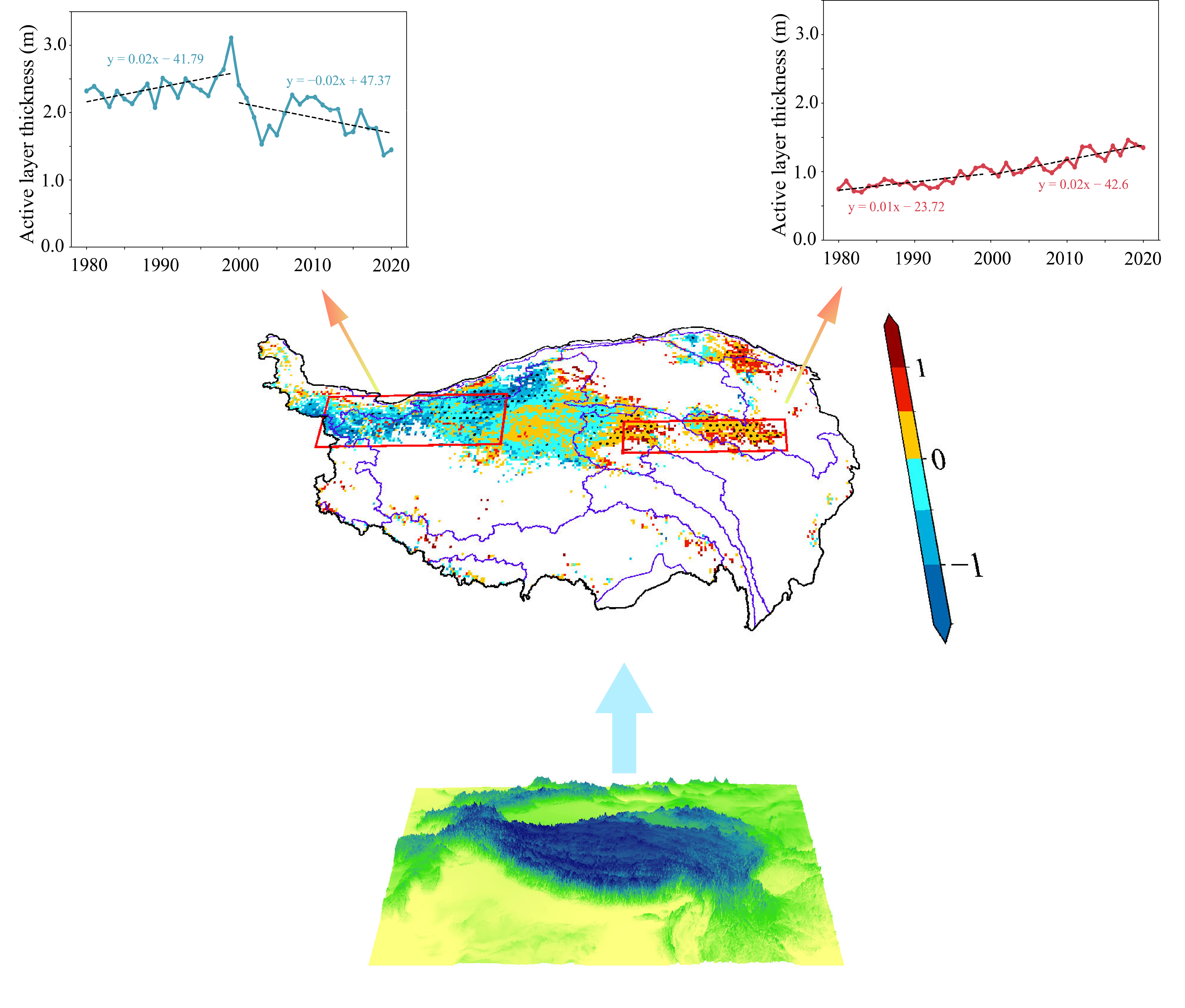 研究表明,青藏高原的活动层厚度在2000年后出现了显著的年代际变化。青藏高原整体活动层厚度由1980–1999年的2.54米减少到了2000–2020年的2.28 米。这种变化主要发生在高原西部的多年冻土区,与东部相比存在明显的区域差异。在东部,多年冻土区的活动层厚度呈持续增加趋势,而非年代际变化。此外,活动层面积在2000年也发生了年代际突变,之前持续下降,但之后几乎没有变化。该研究还发现青藏高原多年冻土活动层的变化和区域差异受到了气温和降水等环境因子的显著影响,反映了其在全球变暖背景下对气候变化的复杂响应。