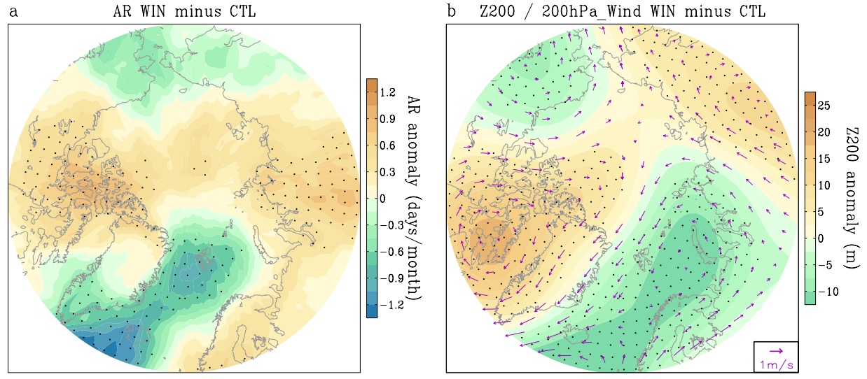 图2. Nudging试验和控制试验中(a)大气河和(b)环流的差异。