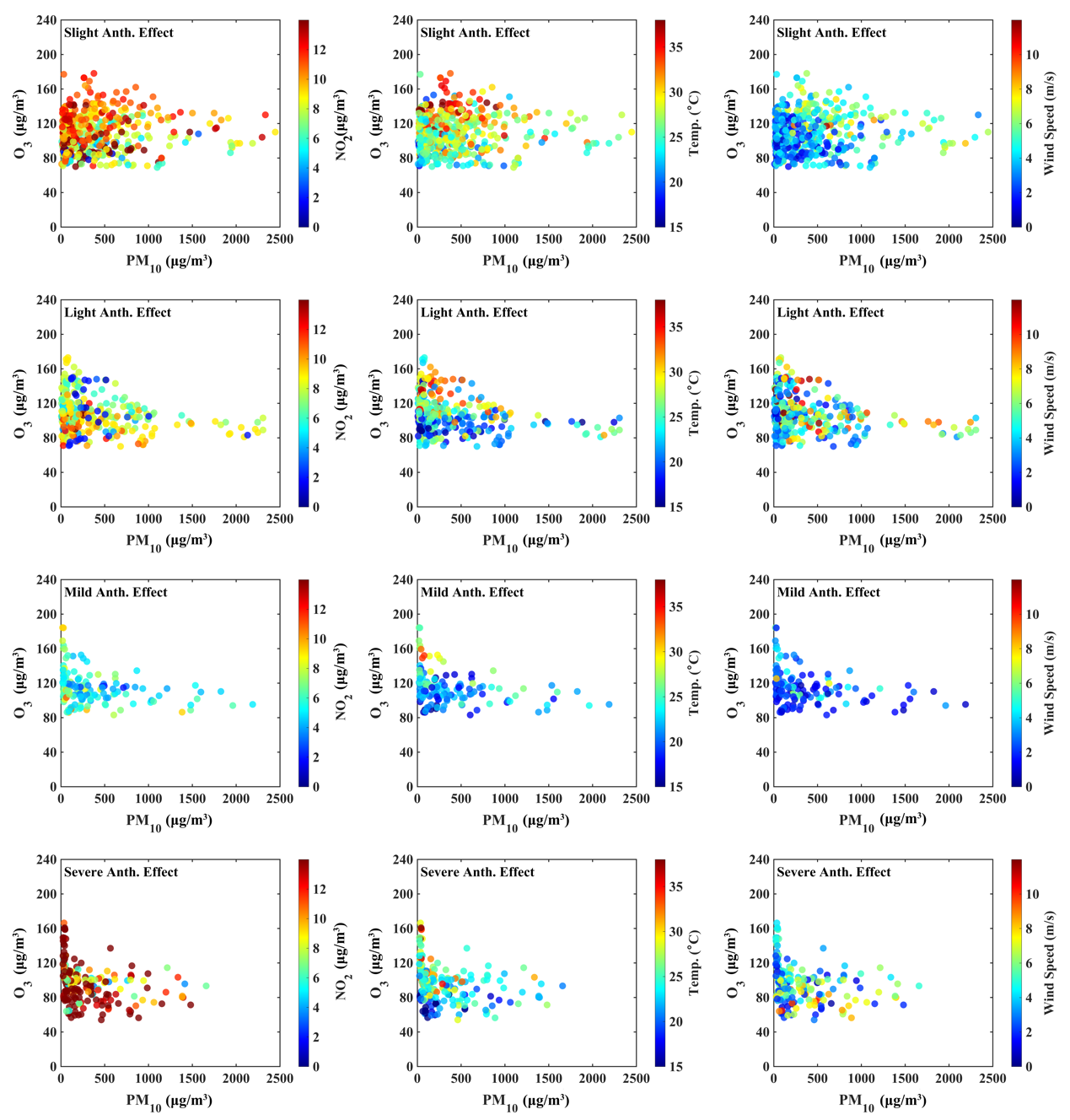 图3. 阿拉善不同区域沙尘天气PM10和O3分布(色标代表的NO2、温度和风速)
