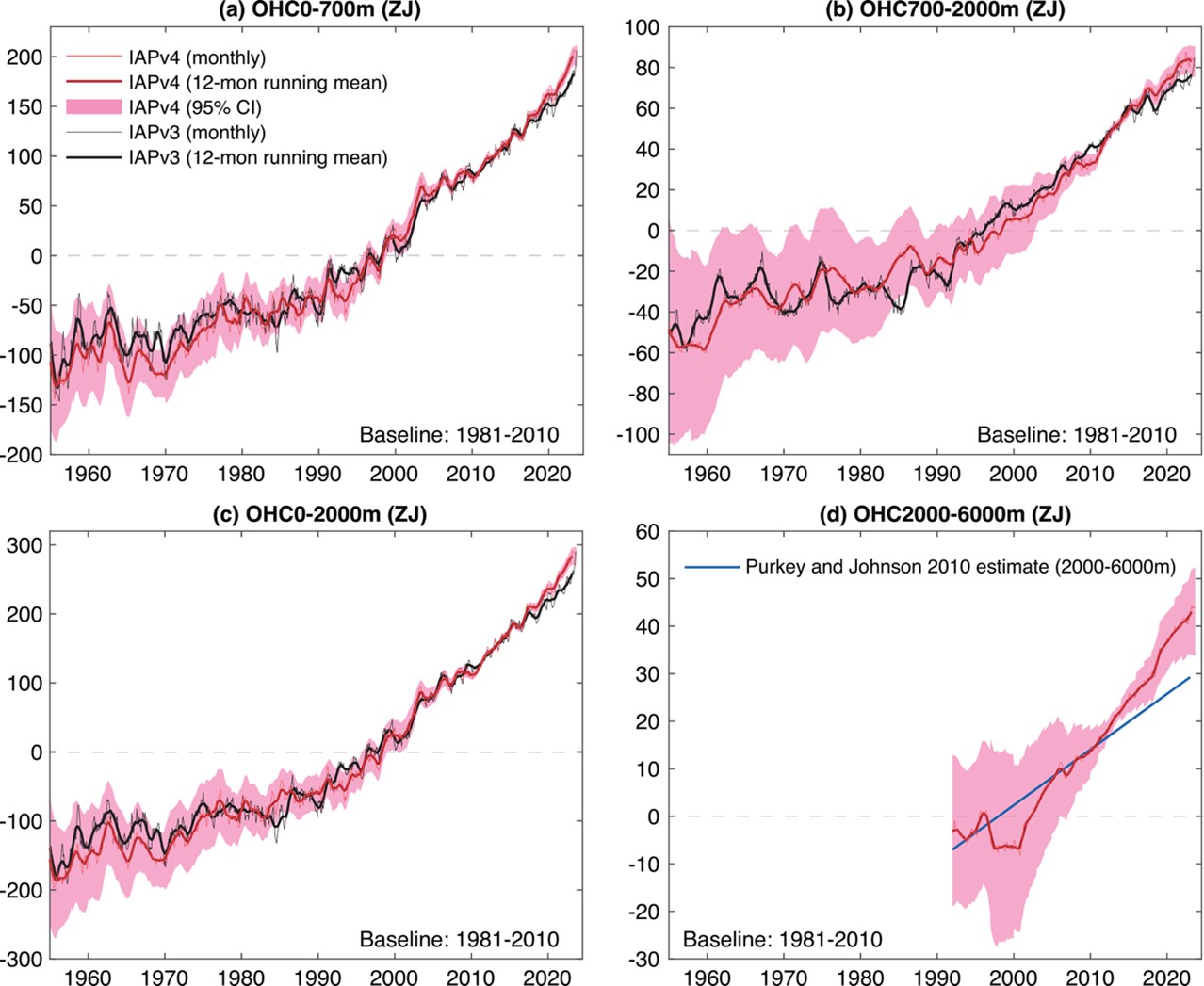 表1. IAPv4和IAPv3数据集对比。IAPv4使用了新一代质量控制、偏差订正、格点化技术,使用了新的气候平均态,提高了数据垂向分辨率。