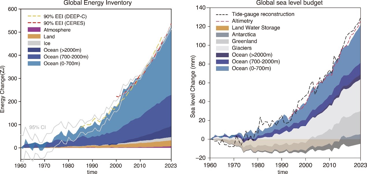 图2. (左图)闭合1960年以来地球系统能量收支。虚线为基于卫星观测数据测算的进入地球的净能量;不同颜色阴影表示基于多圈层观测数据测算出的各圈层储存的能量。(右图)闭合1960年以来全球海平面变化收支。虚线为直接卫星高度计直接观测到的总的全球海平面变化;不同颜色阴影表示基于多圈层观测数据测算出的各因子的贡献。