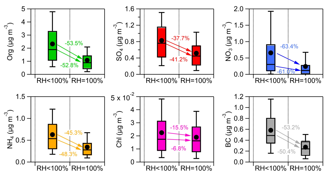 1. RH等于100 %与低于100 %时颗粒物各化学组分质量浓度对比。