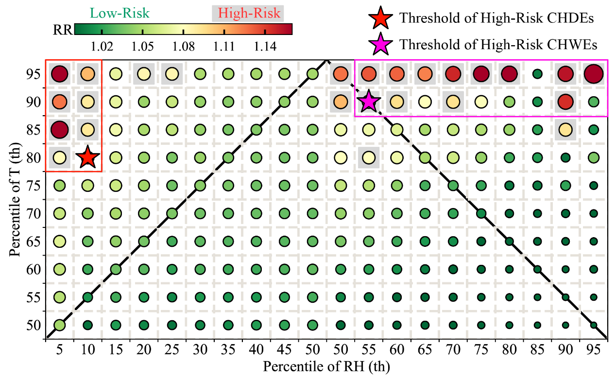 图1 中国不同温度(T)和相对湿度(RH)组合下复合热事件的相对风险(RR)。灰色阴影表示RR超过1.08的T和RH组合。橙色/紫色五角星表示高健康风险CHDEs/CHWEs的T和RH阈值。橙色/紫色框表示与高健康风险CHDEs/CHWEs相关的T和RH阈值。