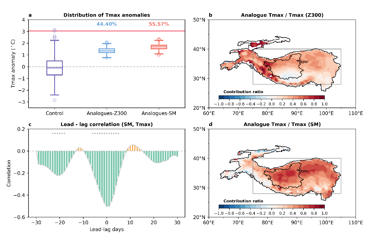 图1大气环流和土壤湿度对2022年青藏高原热浪的贡献。(a) 随机抽样日、相似大气环流日和相似土壤湿度日对应的日最高温度异常的分布。(b, d) 相似大气环流日 (b) 和相似土壤湿度日 (d) 对应合成的日最高温度异常与热浪期间日最高温度异常的比率。(c) 2022年5-9月土壤湿度异常和日最高温度异常的超前滞后相关。