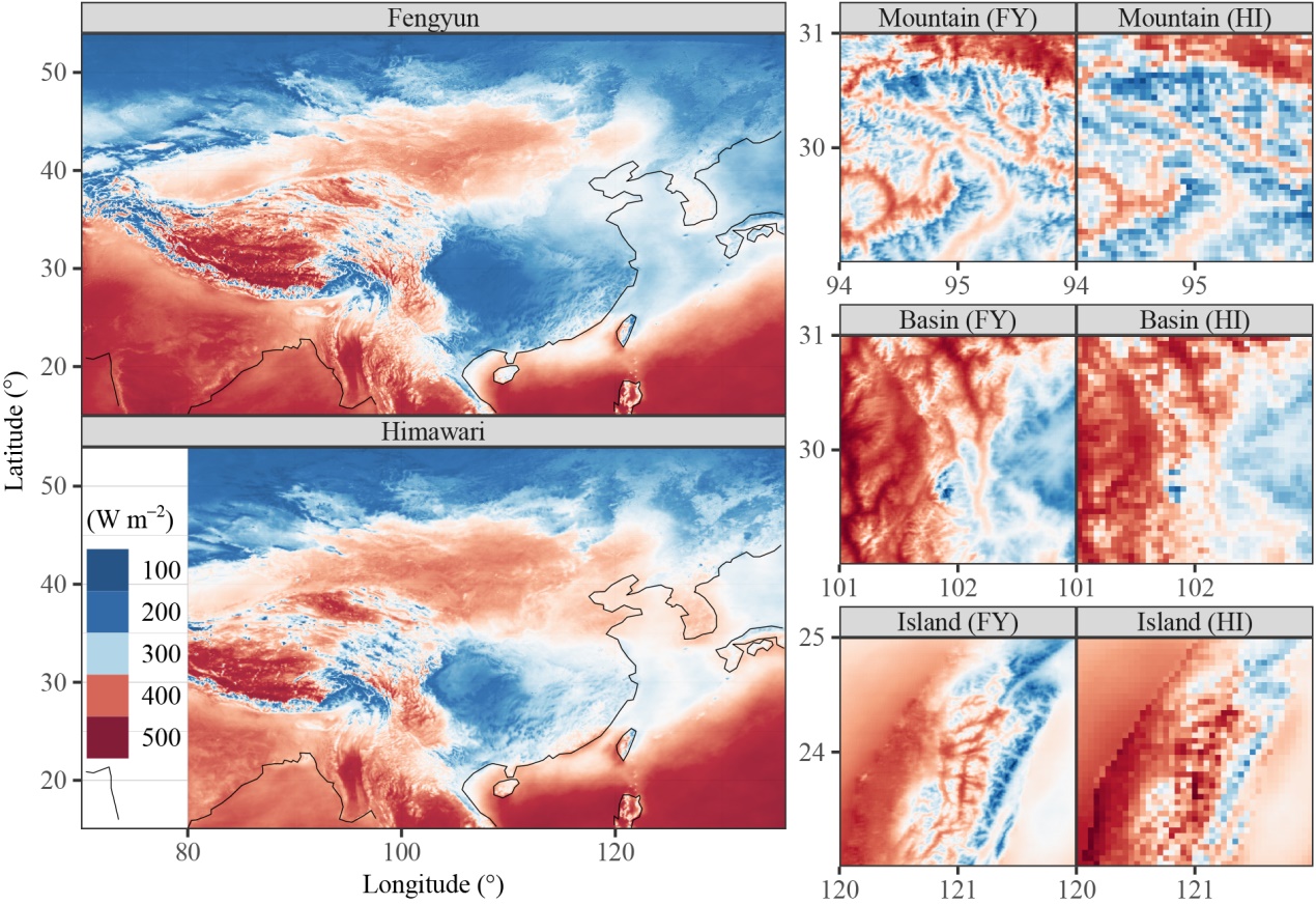 展望文章认为AGRI新增了助力气溶胶和水汽探测的波段,结合先进反演算法,将显著提升地面太阳辐射遥感反演的精度和准确性,其时空分辨率的大幅提升也是AGRI的一大特色,对于太阳能资源评估和预报至关重要。完整覆盖我国的风云反演辐射产品较日本葵花反演辐射产品在分辨率方面有显著提高。然而,风云反演辐射产品成熟度较国外仍有差距。
