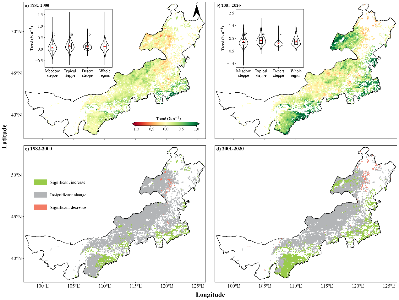为了定量评估研究区草地退化状况及其动态变化,研究人员利用1982年至2020年的长时间序列遥感数据(GIMMS NDVI和MODIS NDVI)在高空间分辨率水平上分别计算了植被覆盖度(Fractional Vegetation Cover,FVC)和草地退化指数(Grassland Degradation Index,GDI)。结果表明,在研究时段内,研究区平均FVC为42%,其中退化草地(GDI<0.9)约占研究区总面积的85%。空间上,FVC和GDI均呈现出显著的空间异质性。东经115°以西区域平均FVC约为21%,其中近98%的区域处于退化状态;而东经115°以东区域平均FVC约为58%,有约68%的区域处于退化状态。时间上,退化草地比例整体呈下降趋势,尤其在最近20年里(2001-2020)。值得注意的是,在最近的十年里(2011-2020),全区仍有约3/4的草地处于退化状态。因此,尽管一系列生态保护措施在一定程度上减缓了研究区草地退化的态势,并在部分地区促进了退化草地的恢复,但全区草地退化问题依然严峻,尤其是在东经115°以西地区,该区域约80%的草地处于中度和重度退化状态(GDI< 0.6)。