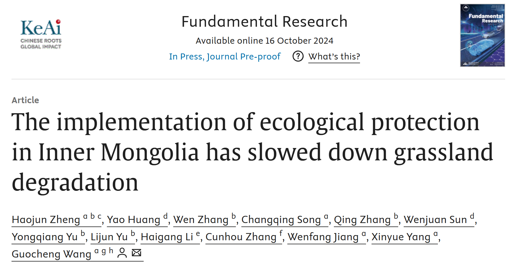 Zheng, H., Huang, Y., Zhang, W., Song, C., Zhang, Q., Sun, W., Yu, Y., Yu, L., Li, H., Zhang, C., Jiang, W., Yang, X., & Wang, G. (2024). The implementation of ecological protection in Inner Mongolia has slowed down grassland degradation. Fundamental Research. https://doi.org/https://doi.org/10.1016/j.fmre.2024.10.006
