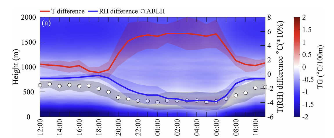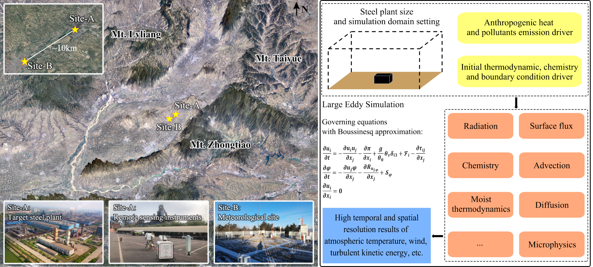 研究所辛金元研究员、马永敬副研究员等和哈佛大学、瓦赫宁根大学学者合作,采用高分辨率边界层垂直结构探测技术和大涡模拟技术,综合探测分析山西某大型钢铁厂边界层垂直结构,发现钢铁厂夜间呈现强的干热岛现象,温度较周边农田高3-10度,湿度低30%-60%。日出,太阳辐射引发的对流活动可短时间破坏夜间的局地小尺度工厂干热岛。日落,随着地面冷却,大气稳定层结生成,工厂干热岛不断加强。利用观测温差约束驱动大涡模型,开展工厂热岛污染传输机制模拟实验,结果表明:工厂强热岛效应可将工厂排放污染物(SO2、CO等)向上传输至残留层,并在残留层顶部向四周扩散,形成典型的“蘑菇云”状污染分布,导致残留层内部高浓度污染积累。随着日出对流活动加强,残留层高浓度污染物会通过熏烟作用对流下传至地面,形成上午峰值现象,由此解释了我国多个典型城市地区SO2、CO等工业示踪物上午峰值现象的产生原因,夜间大气污染管控更为重要。