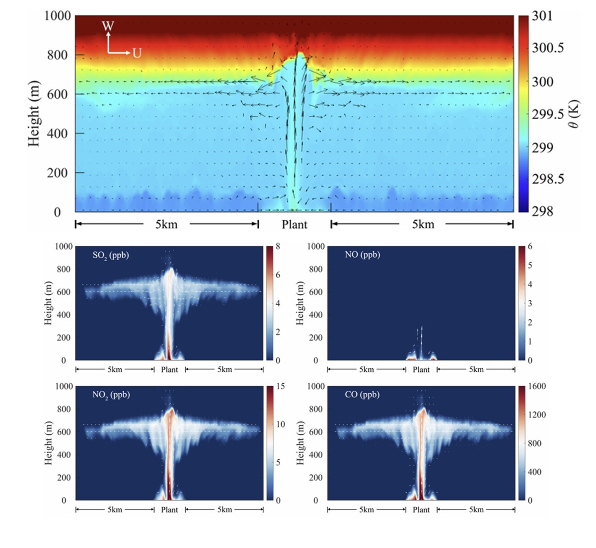 图3.大涡模拟揭示燃煤工厂夜间显著热岛环流与SO2、CO等工业排放污染物的“蘑菇云”分布。