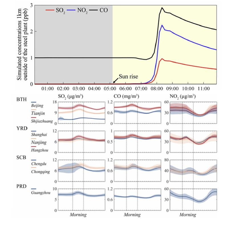 图4.上图为大涡模拟揭示残留层高浓度污染物日出对流“熏烟”下传的地面峰值现象。下图为京津冀(BTH)、长三角(YRD)、川渝(SCB)、珠三角(PRD)地面观测SO2、CO和NO2等上午峰值现象特征。