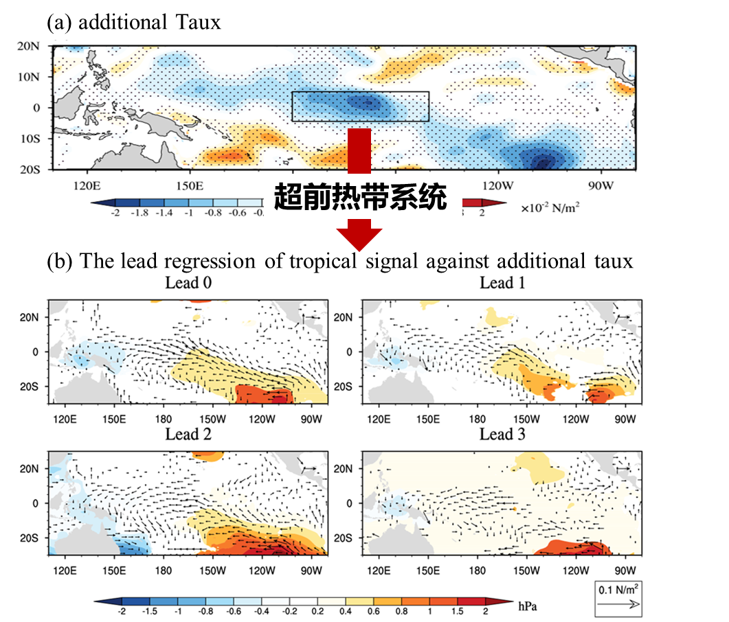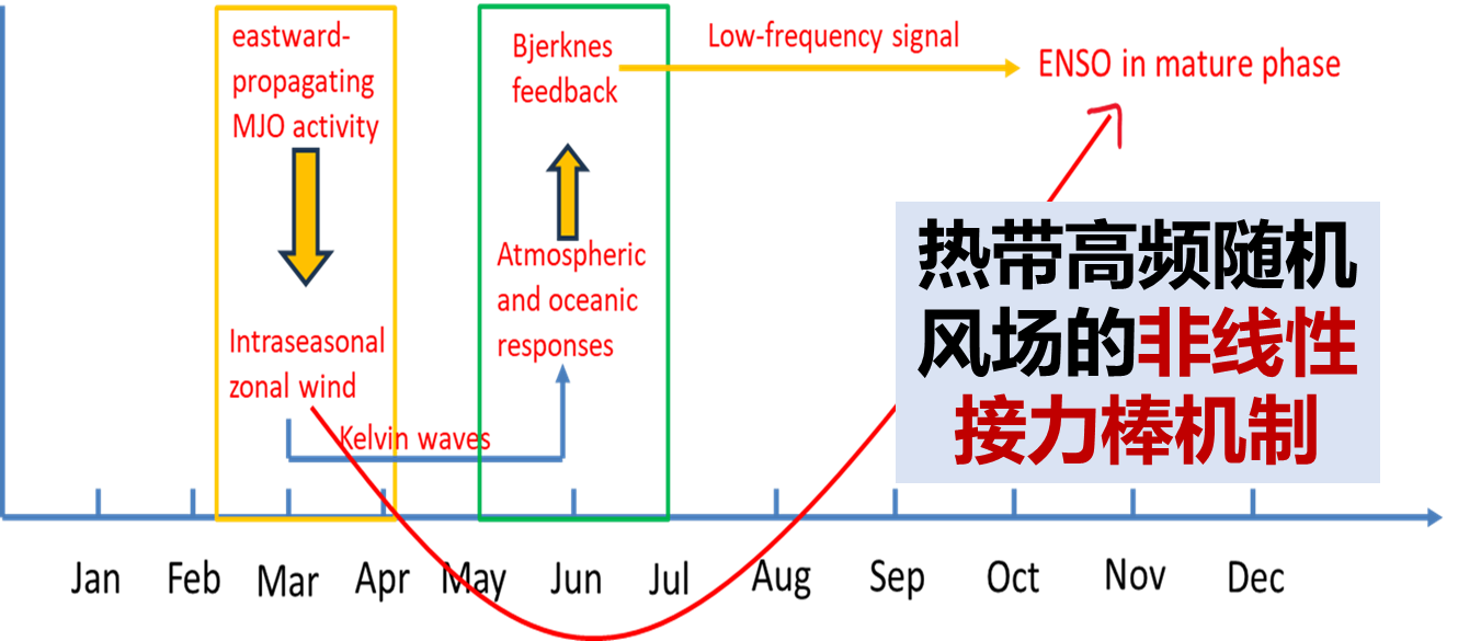 同时,研究还进一步揭示了春季大气风场信号在2000年以后ENSO事件爆发中的重要性,尤其是3月份赤道西太平洋的季节内尺度纬向风信号与ENSO成熟位相的显著关系。这种信号通过激发赤道海洋开尔文波动,对ENSO后续演变的贡献近40%,并形成了ENSO发展过程中热带太平洋海气相互作用从大气高频波动到海洋低频响应的"接力棒"机制。