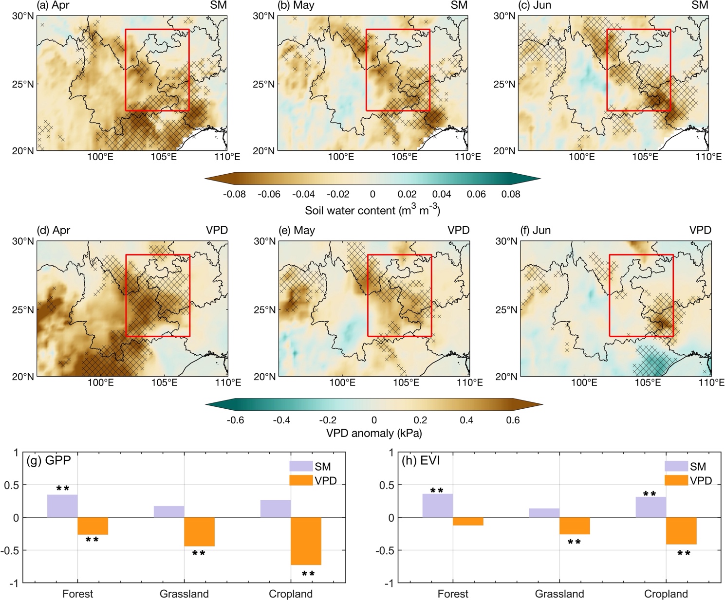 (1)与2010年中国西南地区大范围持续性“世纪干旱”不同,2023年极端高温干旱复合事件发生在前期持续性冬春连旱基础上(Ma et al. 2024),并于春季(4–5月)爆发一系列极端热浪,进一步加剧了土壤水分(SM)匮乏与大气干燥度(水汽压差,VPD)的双重胁迫。由于这一时期正值植被主要生长季,SM和VPD的协同作用对GPP和EVI的影响尤为显著。