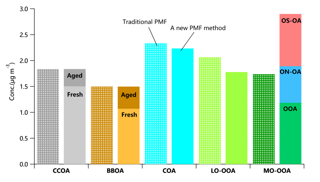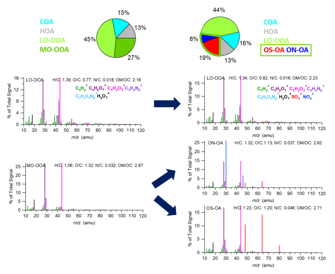 团队发现新发展的来源解析方法所识别的LO-OOA在质谱谱图和时间序列上都表现出与旧方法的解析结果相似的特征。然而,通过旧方法所解析出的MO-OOA则可被新方法进一步分解成多种有机因子。例如,其在夏季可以被分解成:富氮有机气溶胶(ON-OA),富硫有机气溶胶(OS-OA),而在冬季则可被分解成ON-OA,OS-OA,和氧化的有机气溶胶(OOA)。