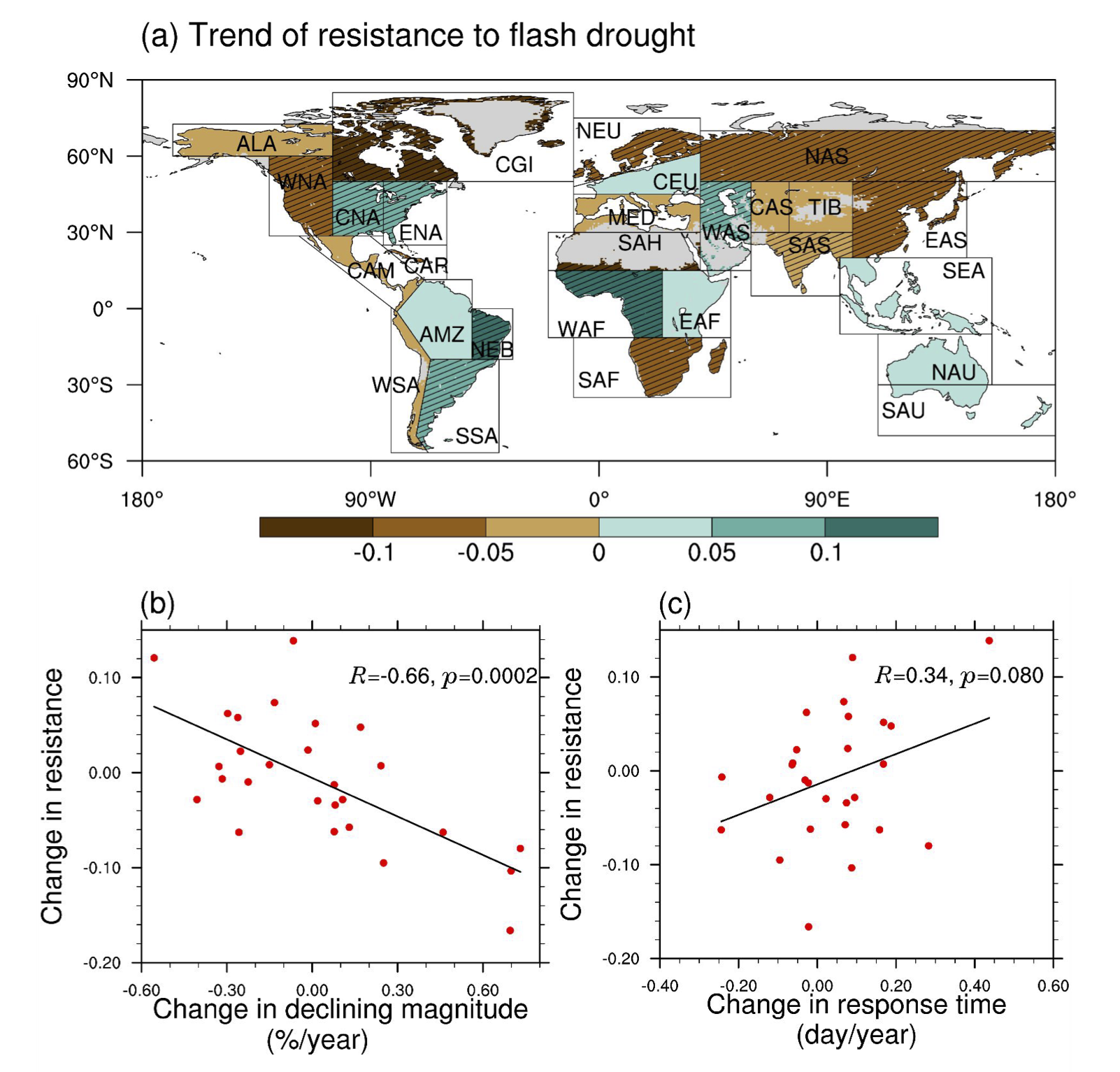 随着气候变化加剧,快速发展的骤旱正成为干旱的一种新常态。近年来,如2012年美国中西部特大骤旱、2022年我国长江流域特大骤旱均导致陆地碳汇显著下降。定量评估生态系统对骤旱的抵抗能力,对于制定适应策略及缓解骤旱影响至关重要。然而,目前全球范围内植被对骤旱的抵抗力及其长期演变趋势仍不明晰。