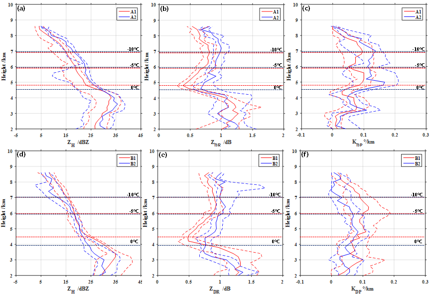 图2 A阶段云系的(a) ZH (b) ZDR (c) KDP和B阶段云系的(d) ZH (e) ZDR (f) KDP的垂直廓线 (红/蓝实线:A1和B1/A2和B2时段云系物理量的中位数;红/蓝虚线:A1和B1/A2和B2时段的25%和75%分位数)。