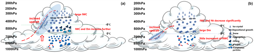 图3 (a) 持续发展增强的WCB、(b) 发展至最强后减弱阶段的WCB影响下云微物理过程的概念模型