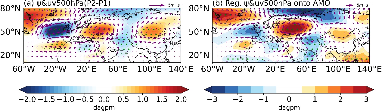 图2:夏季500 hPa流函数和水平风(a)突变点前后的合成差异(b)和1979–2021年春季AMO回归场(打点区域表示通过显著性检验)