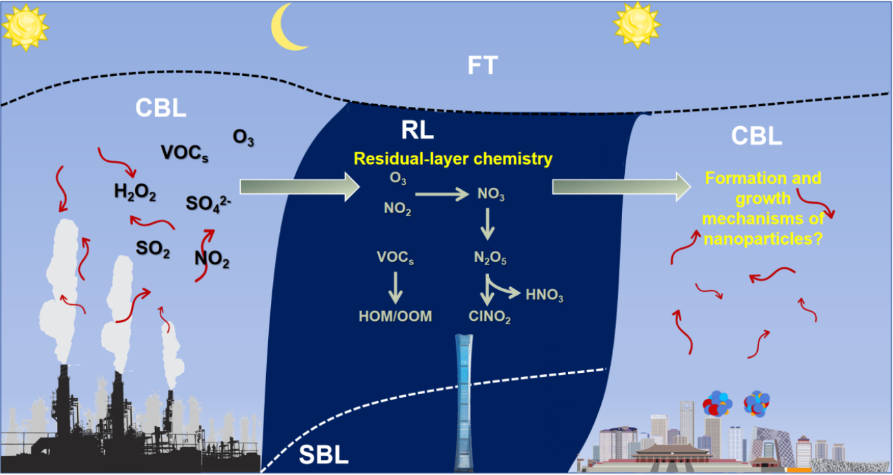 残留层作为夜间稳定边界层与自由大气间的物质能量交换通道,其物理化学过程对边界层内气溶胶与活性气体的垂直再分配产生重要影响。然而,由于残留层在对流层中特殊的位置以及快速演变的性质,对其物理化学过程的原位探测和对近地面空气质量影响的定量评估一直是大气科学领域最具挑战性的研究课题之一。