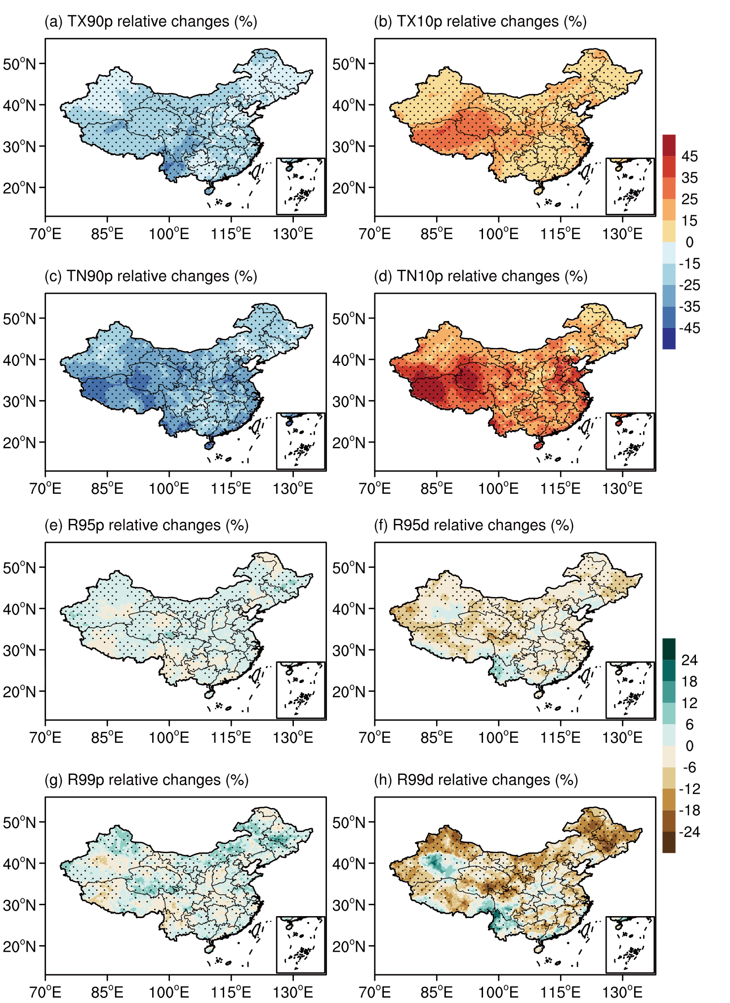 图1基准期从1981-2010更新至1991-2020,1961–2020 年期间,中国极端气候指数的相对变化(单位:%)。(a–d) 表示气温指数,分别为 TX90p、TX10p、TN90p 和 TN10p;(e–h) 表示降水指数,分别为 R95p、R95d、R99p 和 R99d。点状标记表示根据 Wilcoxon 符号秩检验,在 90% 置信水平上差异显著。零值区域以白色表示。