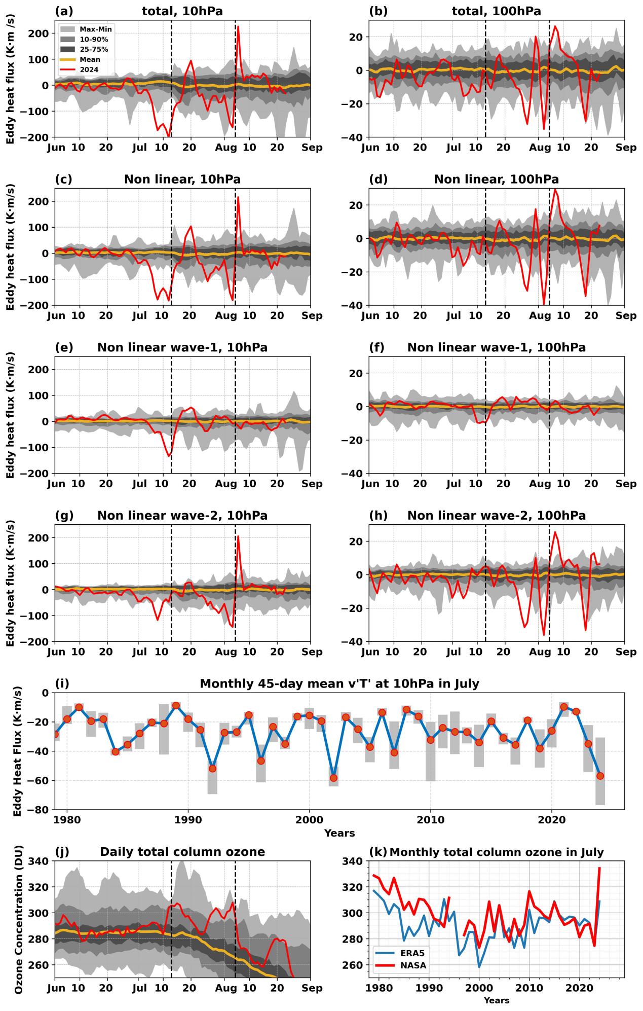 图 3. 各子图时间序列如下:与图 1a 类似,但为 2024 年 6 月至 8 月每日纬向平均涡动热通量(在 10 hPa 和 100 hPa)以及臭氧总柱量的时间序列(红线),平均范围为 45°S–75°S。 (a–b)10 hPa 和 100 hPa 的总涡动热通量;(c–d)10 hPa 和 100 hPa 的非线性项;(e–f)10 hPa 和 100 hPa 的非线性项的波1分量;(g–h)10 hPa 和 100 hPa 的非线性项的波2分量;(i)1980–2024 年 7 月,45°S–75°S 平均的 10 hPa、45 天滑动平均的涡动热通量(月平均值,蓝线),灰色柱状表示 7 月的历史最大值和最小值;(j)与图 1 类似,但为每日臭氧总柱量;(k)1980–2024 年 7 月的臭氧总柱量月平均值,蓝线表示 ERA5 再分析数据,红线表示 NASA 数据。