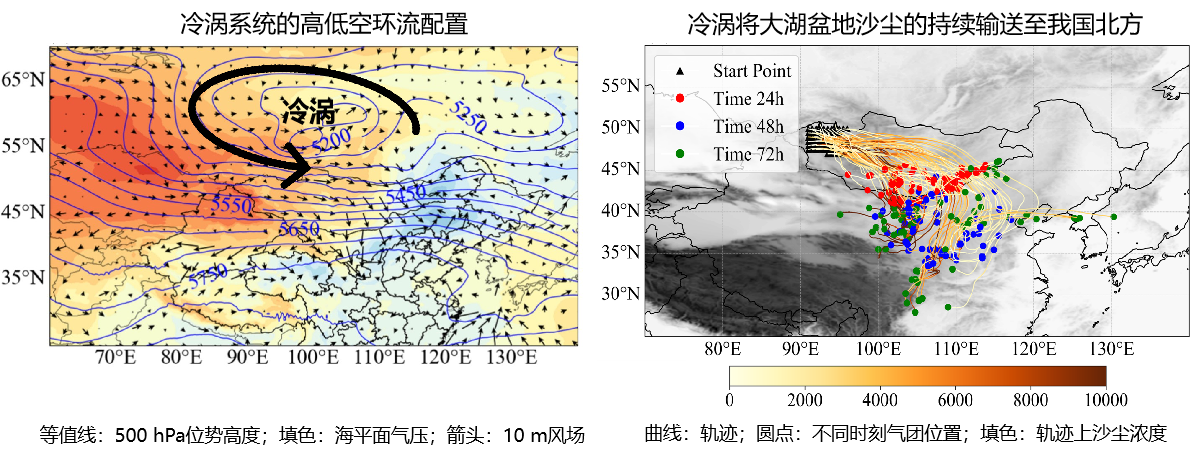 研究发现,对流层中层的冷涡系统显著控制着大湖盆地沙尘的抬升和远距离输送过程。冷涡西侧的冷平流和东侧的暖平流分别促使近地面反气旋与气旋的形成,二者之间的强烈西北风与上升运动有效地将沙尘输送至高空。此外,冷涡形态决定了沙尘输送路径的差异:西风带中形状较规则的冷涡主要将沙尘向东输送至东北地区,而纬向伸展的冷涡则推动沙尘向东南方向输送,更广泛地影响中国北方地区。