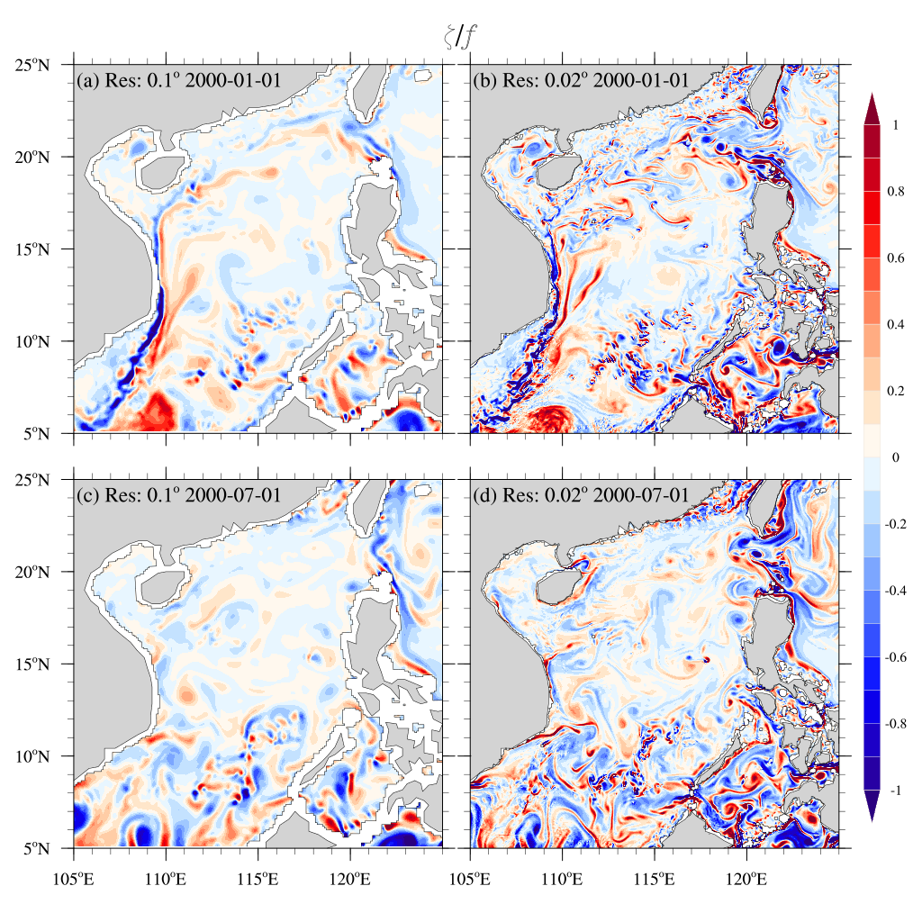 在使用远低于同等超高分辨率全球模式的计算和存储开销下,该研究成功实现了在南海区域超高分辨率(0.02°)、在其它区域高分辨率(0.1°)的长期稳定全球海洋模拟。研究结果表明,当南海区域分辨率从0.1°提升至0.02°时,模式对亚中尺度过程的刻画能力得到显著增强,可以有效捕捉锋生、地形尾流产生的亚中尺度流动现象及其季节变化,为深入研究区域海洋动力过程提供了新的技术手段。