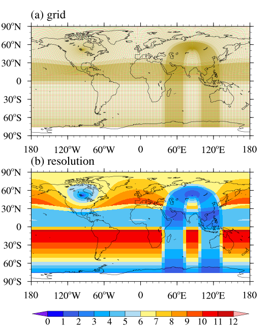 图1 (a)加密后网格分布示意图,(b)加密后网格分辨率,单位为km