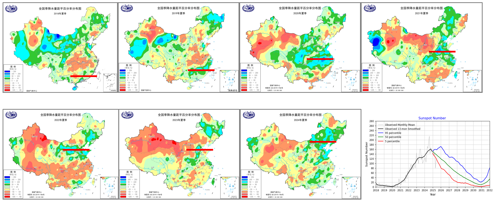 太阳是地球气候系统的主要能量来源,其活动通过总辐射、紫外辐射、高能粒子沉降等多种形式影响地球大气。观测表明,第24太阳活动周(2008-2019年)是过去百年中最弱的周期,最近的第25太阳周(2020年以来)太阳活动又重新活跃,太阳爆发活动逐年增多,出现多次剧烈的太阳爆发活动。另一方面,第25太阳周以来,中国夏季降水雨带持续逐年偏北(如图1)。那么,这两者之间是否存在联系?是一个值得研究的问题。长期以来,关于太阳活动是否和如何影响东亚地区天气气候变化的,也尚未有明确答案。