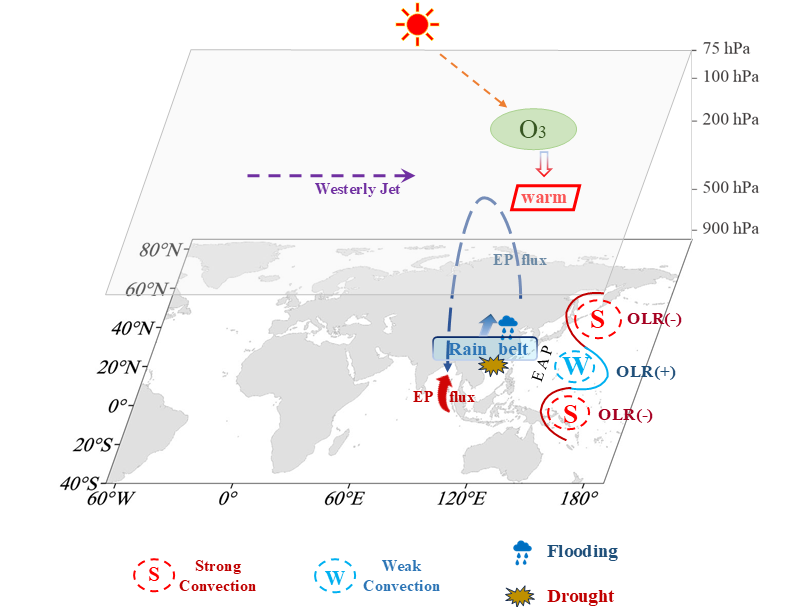 该研究主要揭示了在年代际尺度上,在东亚梅雨季中国降水型(南北反相)受11年太阳周期调制:在太阳活动高年期间,中国长江以北的季风区降水较常年偏多,而长江以南地区降水偏少(图2)。机制分析表明,东亚-太平洋大气遥相关(EAP)在其中起到重要作用。在太阳活动高年,太阳辐射增强导致热带和副热带平流层低层臭氧增多加热大气,引发暖异常。该异常通过增强西风急流等动力过程能够影响到对流层环流,激发西太平洋异常对流活动,进而强化EAP遥相关型,促使季风雨带北移(图3)。数值试验表明,若剔除太阳活动信号,降水南北反位相模态的强度显著减弱,证实了太阳强迫的核心作用。