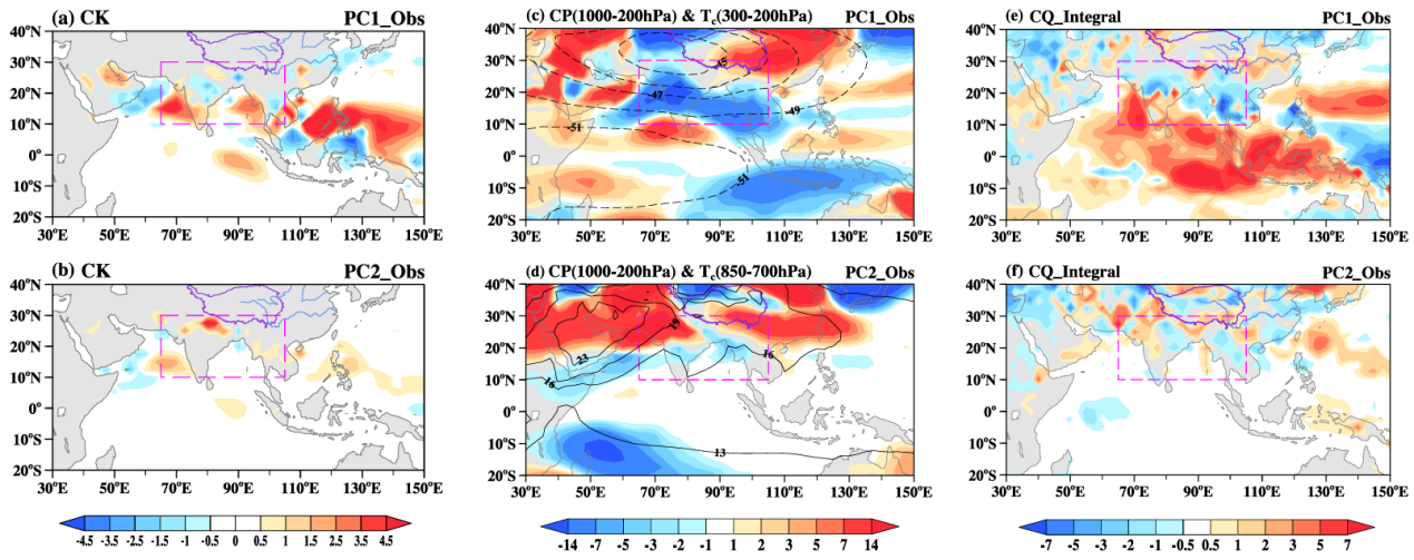 图1 南亚夏季风年际变率两主导模态的能量转换特征。(a-b)与前两模态相关的850 hPa正压能量转换(CK),正值表示能量从气候态平均流向异常模态转换。(c-d)与(a-b)相同,但为1000 hPa至200 hPa垂直积分的斜压能量转换(CP),正值表示能量从气候态热力结构向异常模态转换。(e-f)与(c-d)相同,但为垂直积分的对流加热反馈(CQ),正值表示对流加热(冷却)增强暖(冷)温度扰动,从而生成扰动有效位能。