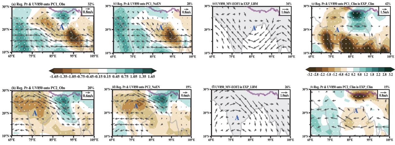 图2 观测与模式中的南亚夏季风年际变率两主导模态的环流特征。南亚夏季降水与850 hPa纬向风MV-EOF(a)第一和(b)第二模态的空间分布。(c–d)与(a–b)相同,但为线性去除ENSO影响后的结果。(e–f)线性斜压模式(LBM)中,132个理想非绝热强迫实验的夏季850 hPa水平风场MV-EOF第一和第二模态的空间分布。(g–h)与(a–b)相同,但来自气候态数值实验(ECHAM5.4,海温与海冰固定为气候态值)的结果。