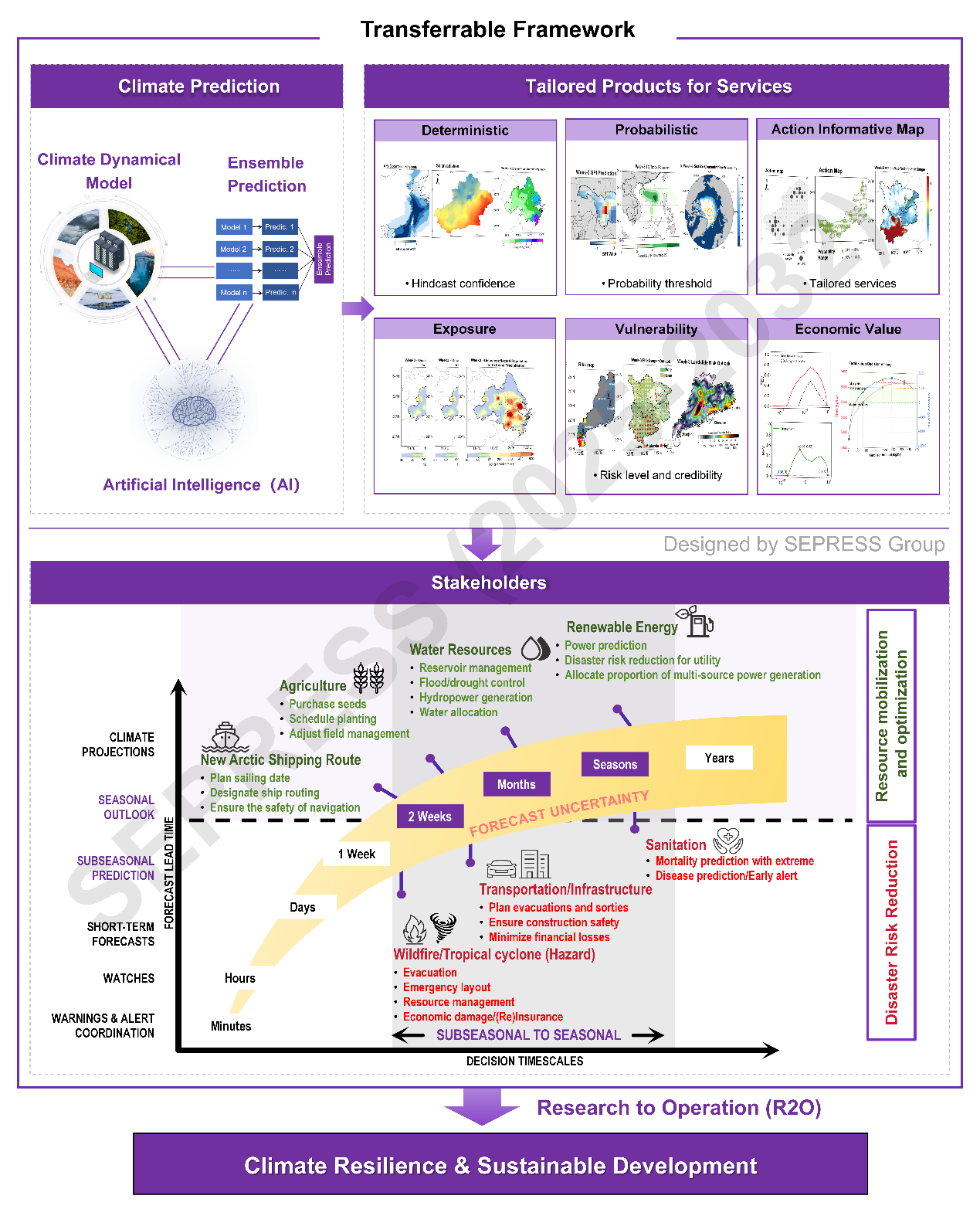 综述文章近日被《大气科学进展》审稿接收。综述从两个核心板块出发。第一部分针对防灾减灾(Disaster Risk Reduction, DRR),分别以野火、洪水、热带气旋为范例,依次详细介绍如何将次季节预测信息转化为指导早期预警和防灾减灾决策的有效信息,提供“行动风险”预测图,从而切实减少对自然环境、基础设施、人类健康和经济的损失。第二部分针对资源的利用和优化(Resource allocation and optimization),聚焦了可再生能源、水资源、航运和农业等部门,详细介绍如何将次季节预测信息转化为助力资源最优化调配和利用的有效信息。
