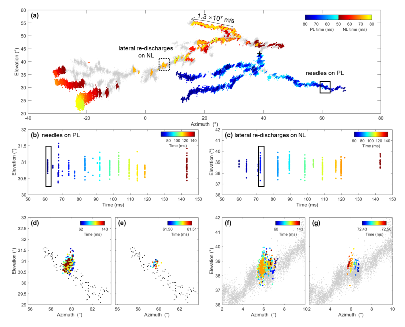 图为回击前甚高频辐射源的时空演化。(a) 50–80 ms 时间段内的方位–仰角分布;(b) 正先导(PL)针状放电的时间演化,对应图 (a) 中的实心黑色矩形区域;(c) 负先导(NL)侧向再放电的时间演化,对应图 (a) 中的虚线黑色矩形区域;(d) 图 (b) 所示 50–145.8 ms 时间段内 PL 针状放电的空间演化;(e)为图 (b) 中约 61 ms 时刻的瞬时 PL 针状放电结构;(f) 为图 (c) 所示 50–145.8 ms 时间段内 NL 侧向再放电的空间演化;(g) 图 (c) 中约 72 ms 时刻的瞬时 NL 侧向放电结构。所有甚高频辐射源均以时间着色。灰色点表示初始负先导活动,黑色点表示回击后出现的反冲先导辐射源。