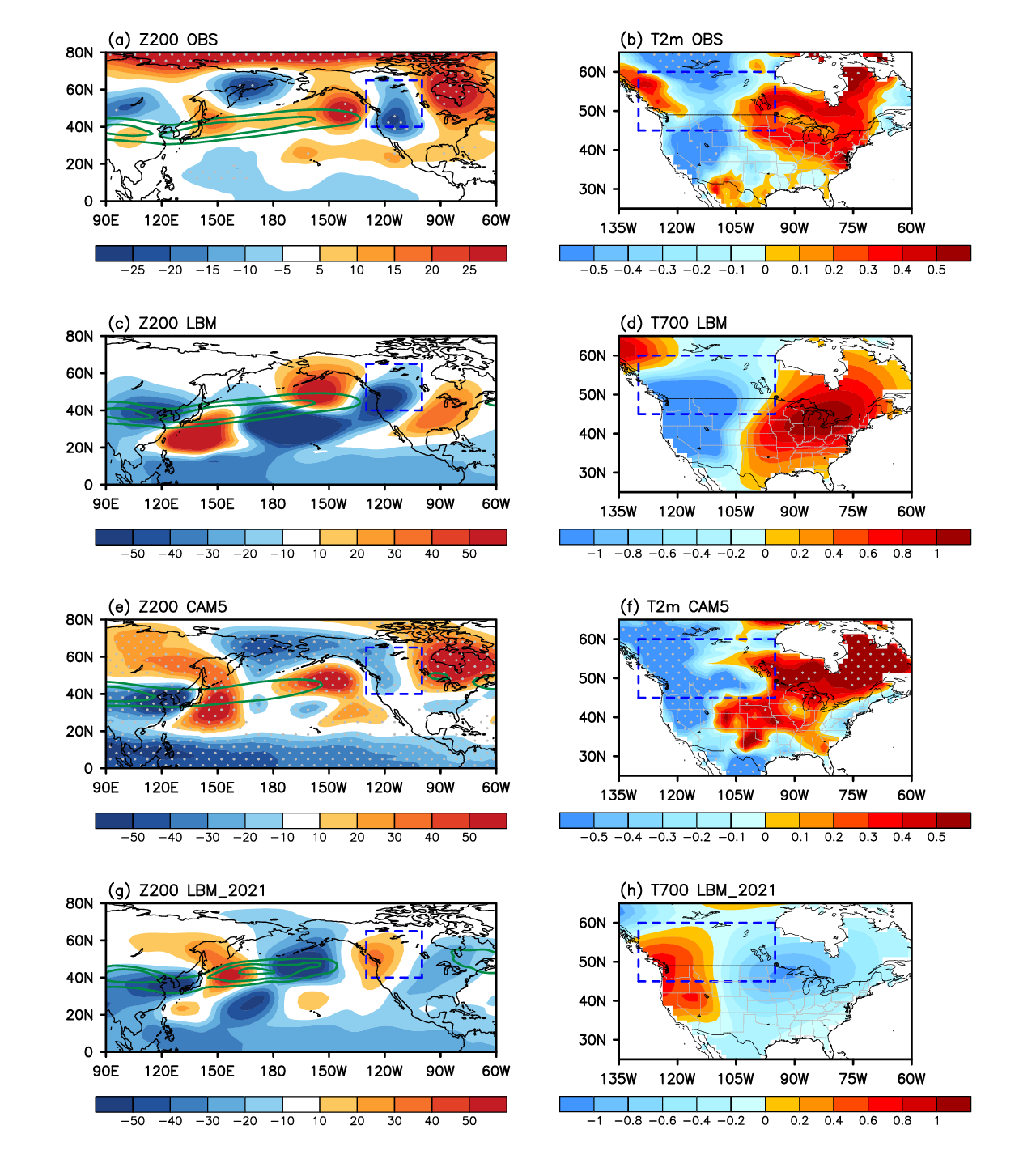 图中展示了“能否”与“是否”的差异。基于2021年6月下旬季风活动的历史统计回归(第一行)、线性斜压模型LBM(第二行)和社区大气模型CAM5(第三行)证实,从一般规律看,此类季风活动会为北美西北部降温;但在2021年本次事件的特定大气环流下(以2021年6月实况为背景;第四行),同样的季风强迫却导致了显著增温。这清晰表明,事件的具体背景能根本性地改变驱动因子的作用。