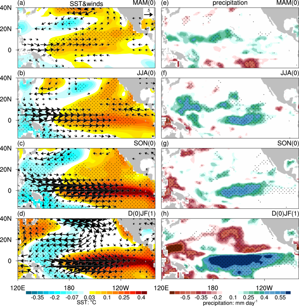 图1. 冬季北极关键区海冰异常对次年冬季ENSO事件的影响。(a-d) 左列为基于前冬北极海冰指数回归得到的SST及850hPa风场异常,(e-h) 右列为对应的降水异常。(a-d) 中打点区域表示SST异常通过95%置信度检验,(e-h) 中打点区域表示降水异常通过95%置信度检验。
