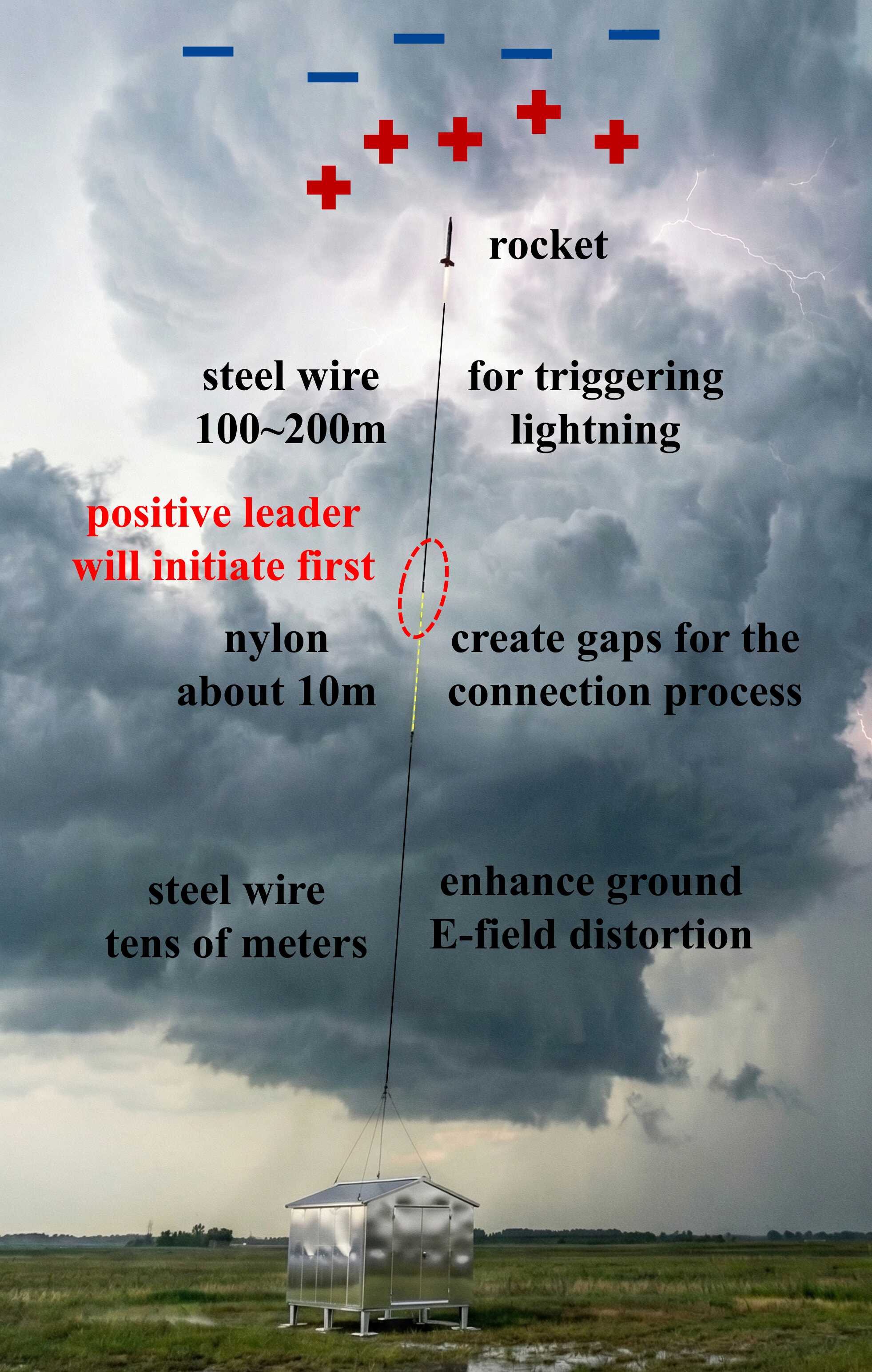 图2. 提高正极性闪电引发效率的空中引雷改进技术方案示意图。在常规空中引雷悬空导线下方,布设数十米接地导线(或高塔)以增强电场畸变;悬空导线与接地结构之间通过约10m的尼龙绝缘线连接,为连接过程创造空间间隙。