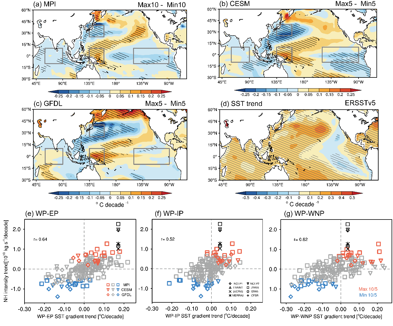 图2. (a–c) 分别给出了 MPI-GE(Max10–Min10)、CESM1-CAM5(Max5–Min5)和 GFDL-CM3(Max5–Min5)大样本模拟中,最强与最弱成员之间春季海表温度(SST)线性趋势的合成差异(阴影)。(d)观测春季 SST 线性趋势。 (e-f) 三套大样本模式共 160 个成员中,TWP–TEP、TWP–TIP 和 TWP–WNP SST 梯度趋势(横轴)与北半球 WPHCI趋势(纵轴)的散点关系图。