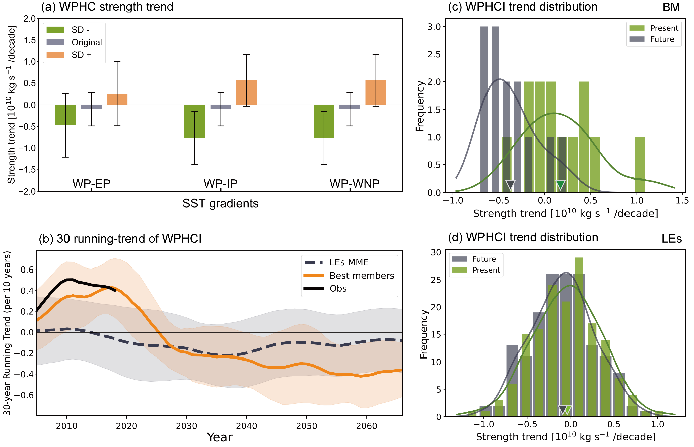 近期,中国科学院大气物理研究所和云南大学研究团队,利用多套大样本集合模拟和观测资料,系统揭示了近40多年来WPHC强度变化的成因及其未来演变特征,表明在近几十年环流增强过程中,由热带多海盆海表温度梯度主导的内部变率占据主导地位。相关成果以 “Recent strengthening of the Western Pacific Hadley Circulation driven by tropical inter-basin sea surface temperature gradients” 为题,发表在 Geophysical Research Letters上。