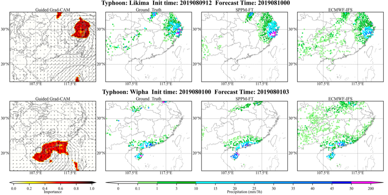 ② 深度学习“物理黑盒”解释:研究团队利用Guided Grad-CAM可解释性方法,揭示了模型在预报极端降水时的注意力机制。分析表明(图2),模型不仅关注气旋中心,还能自适应地捕捉到台风外围螺旋雨带和关键水汽输送通道。这证明了该模型能够自主学习并捕获具有明确气象物理意义的大尺度环流与局地极端降水之间的空间关系,增强了人工智能在离散点天气预报中的科学可信度。
