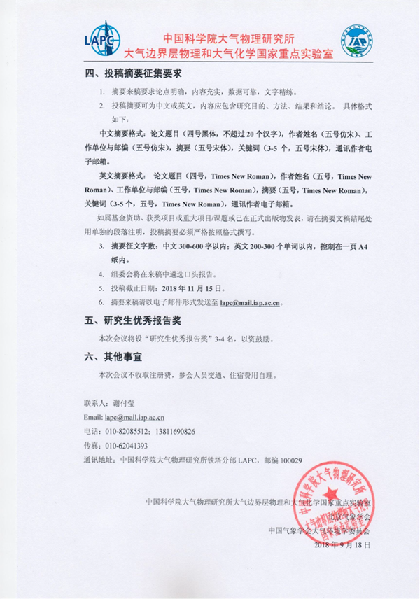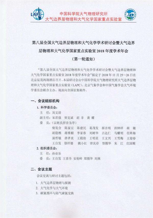 关于召开“第八届全国大气边界层物理和大气化学学术研讨会暨大气边界层物理和大气化学国家重点实验室2018年度学术年会”的通知(第一轮通知)
