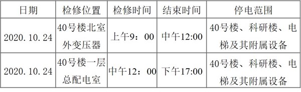 为了确保所内供电设施设备正常运行,根据国家《电力设备预防性试验规程》及物业工程部年度设备保养计划,兹定于2020年10月24日上午9:00至下午17:00对所内供电变压器及其附属配电设施设备进行电力系统预防性工作试验及保养。为杜绝出现安全事故,保养期间将造成部分区域停电,具体保养停电时间如下: