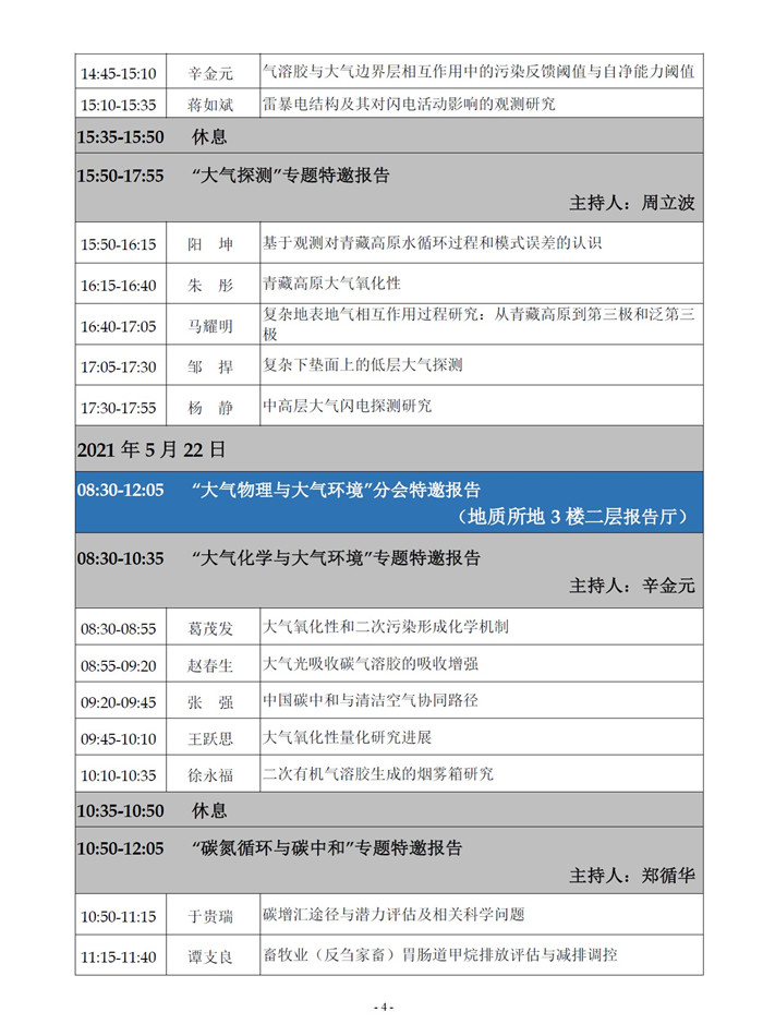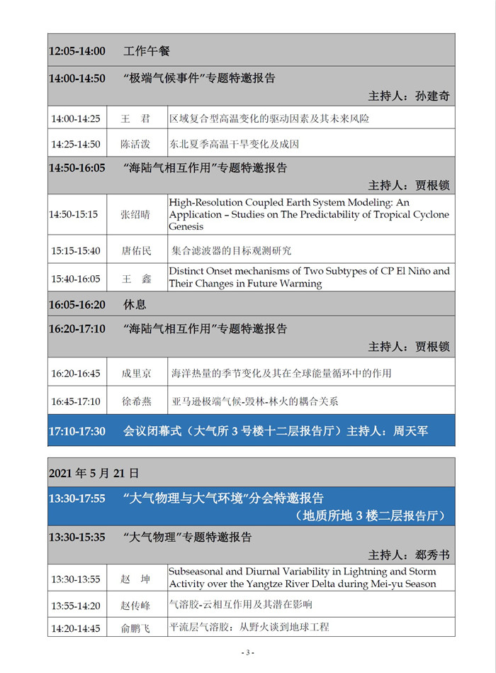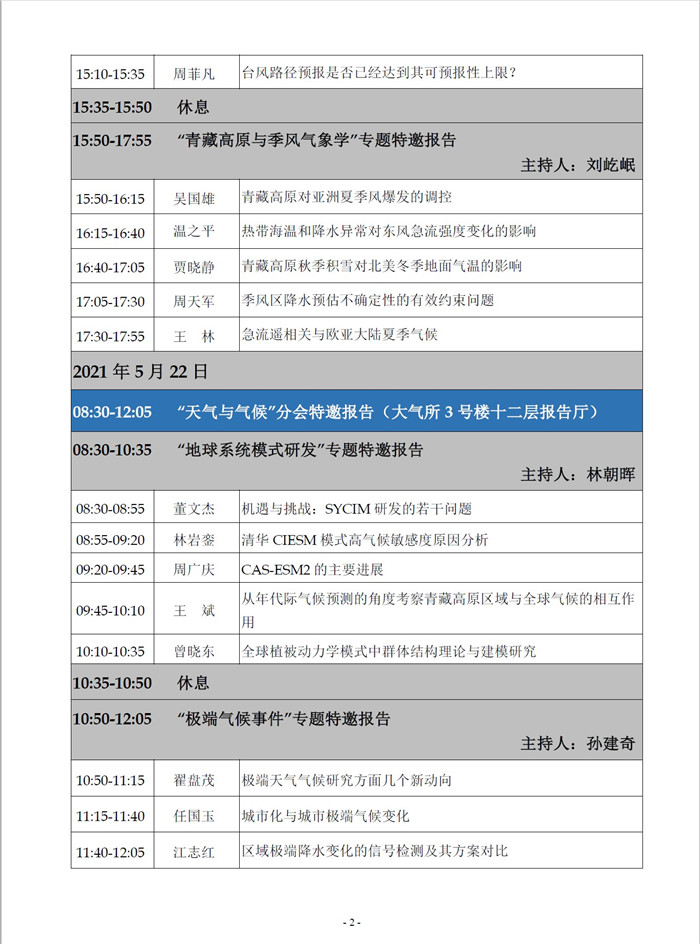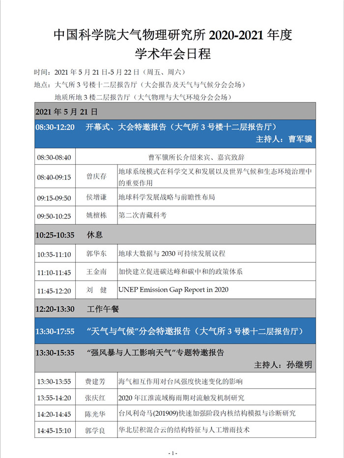 大气物理研究所2020-2021年学术年会定于2021年5月21-22日在大气物理研究所3号楼十二层报告厅及地质所地3楼二层报告厅举行。学术年会会期共两天,其中大会特邀报告半天,分会特邀报告一天半。两个分会主题分别为“天气与气候”和“大气物理与大气环境”,每个分会下设五个专题。