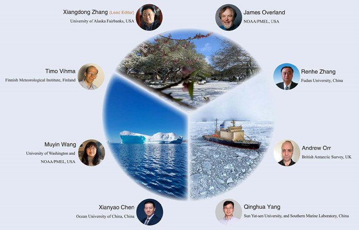 北极气候系统的显著变化仍在持续:在过去的四十年里,北极地表及对流层低层的增温速率超过了全球增温速率的2倍,这种现象被称为北极放大效应(Arctic Amplification)。近十年的增暖趋势进一步加强,北极放大效应愈加明显。自有连续卫星观测以来,北极海冰范围在各季节均呈下降趋势,其中9月北极海冰范围平均每10年减少13.1%,且海冰冻结推迟至深秋甚至初冬开始。与此同时,北极大气和海洋动力过程也发生了显著变化,例如最近观测到的冬季波弗特高压崩溃、平流层极涡减弱、大西洋和太平洋增暖。而这些变化并不局限于北极,还与热带、中低纬度的气候和天气异常事件相关。