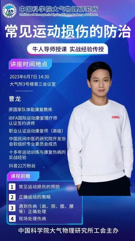 2023年6月10日是中国科学院第十二个“全民健身日”,为积极推进全民健康运动,普及科学运动知识,有效预防运动损伤,帮助广大职工和研究生正确认识身体情况,从运动中受益,激励大家以强健体魄投身科技创新工作。所工会定于2023年6月7日下午2:30在3号楼第三会议室举办《常见运动损伤的防治》健康主题讲座,邀请职业认证运动康复师讲授相关知识。