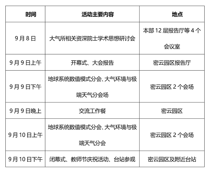 值此大气物理所建所95周年之际,定于2023年9月8-10日召开大气物理研究所2023年度学术年会,会期共2.5天。其中,将在9月8日在大气所本部举办院士学术思想研讨会,9月9日-10日在大气物理研究所密云园区举办年会学术报告活动。学术年会大会特邀报告半天,学术年会分会特邀报告一天,闭幕式及教师节庆祝活动半天。两个分会主题分别为“地球系统数值模式”和“大气环境与极端天气”,每个分会下设5个专题。会议具体日程将另行通知。
